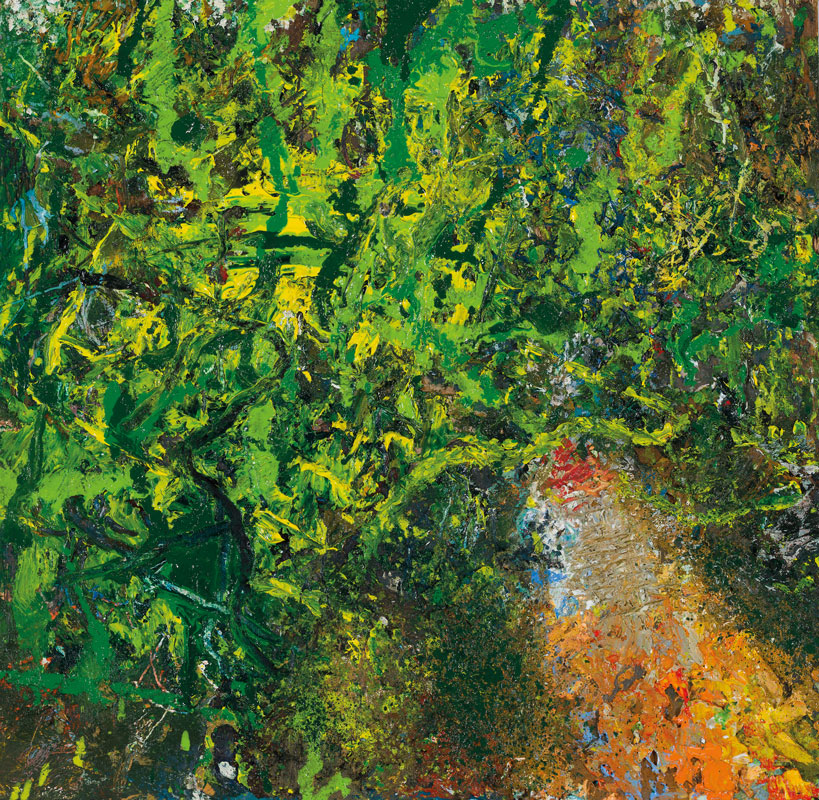 Over the Kea plum trees from Bethel, Coombe. 2023. <br> <strong> mixed media on canvas. <br> 193 x 186cm. <br> JF2103 <br> <br> POA </strong>View Larger Image