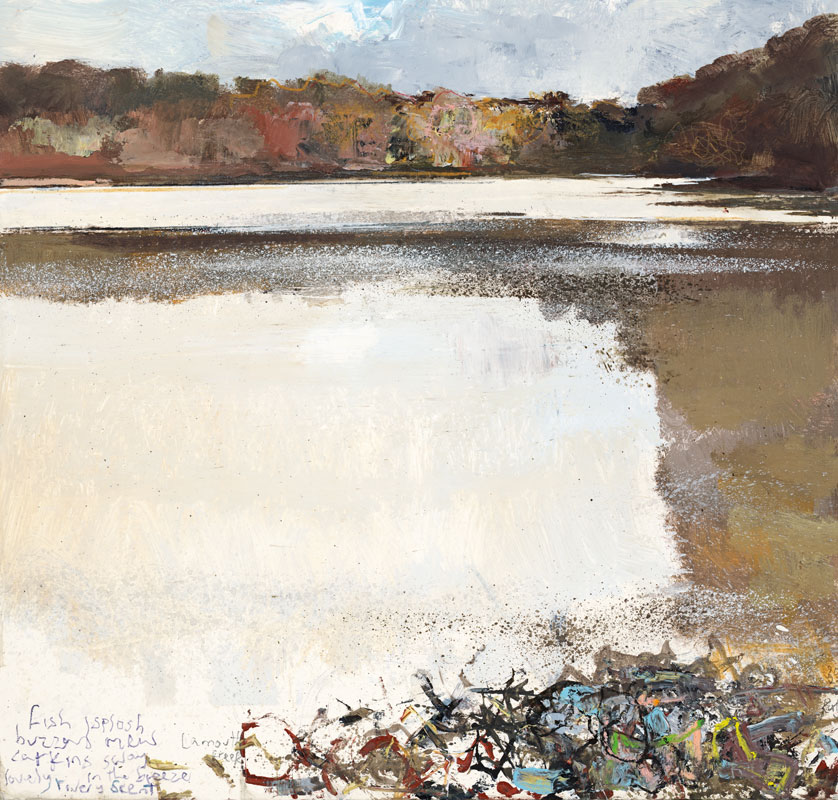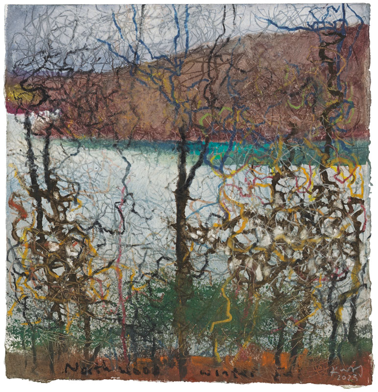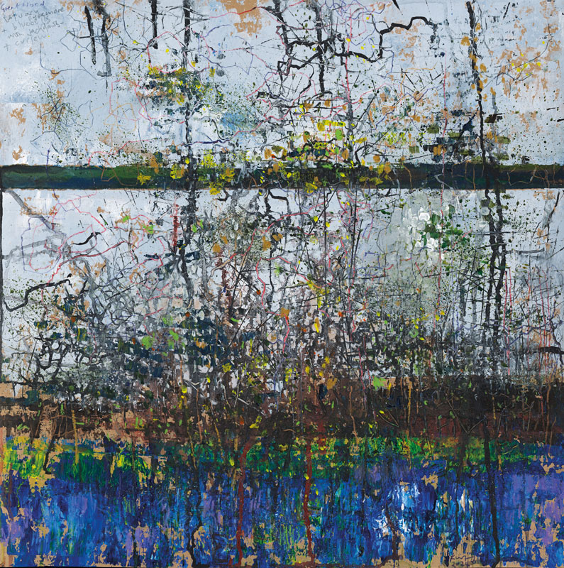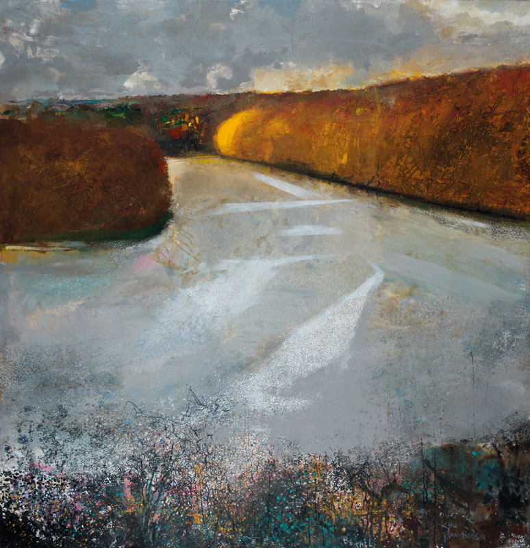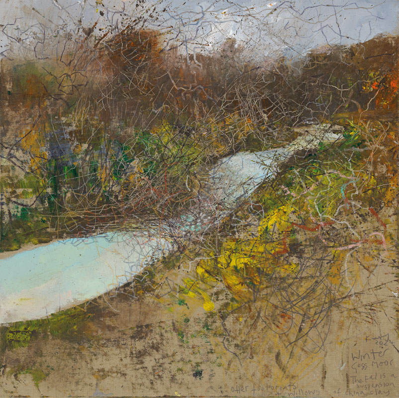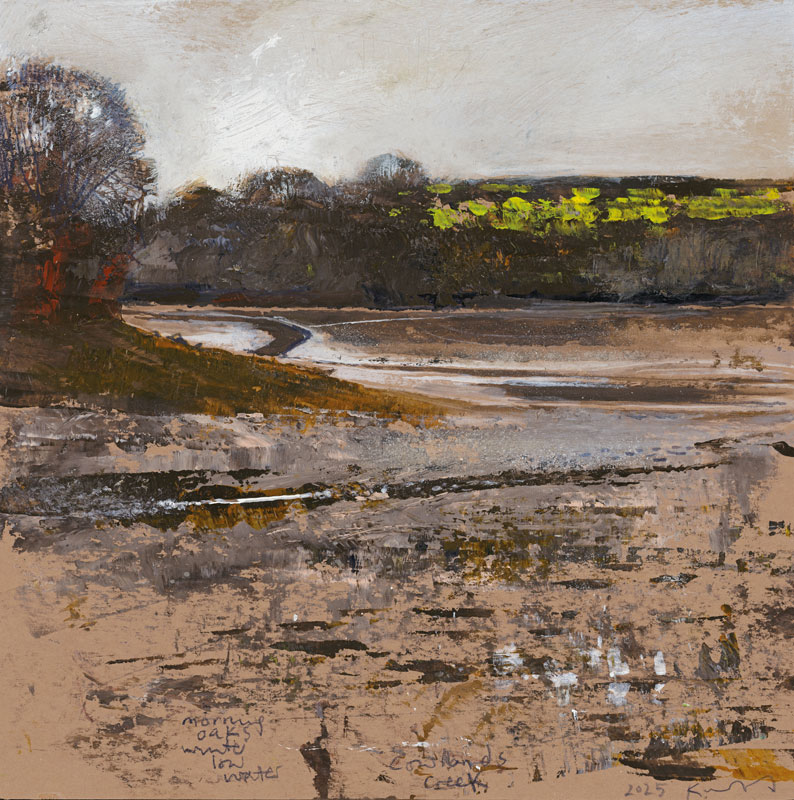 Morning oaks, winter low water. 2025. <br> <strong> mixed media on board. <br> 40 x 40cm. <br> JF2109 <br> <br> £6,500 </strong>View Larger Image