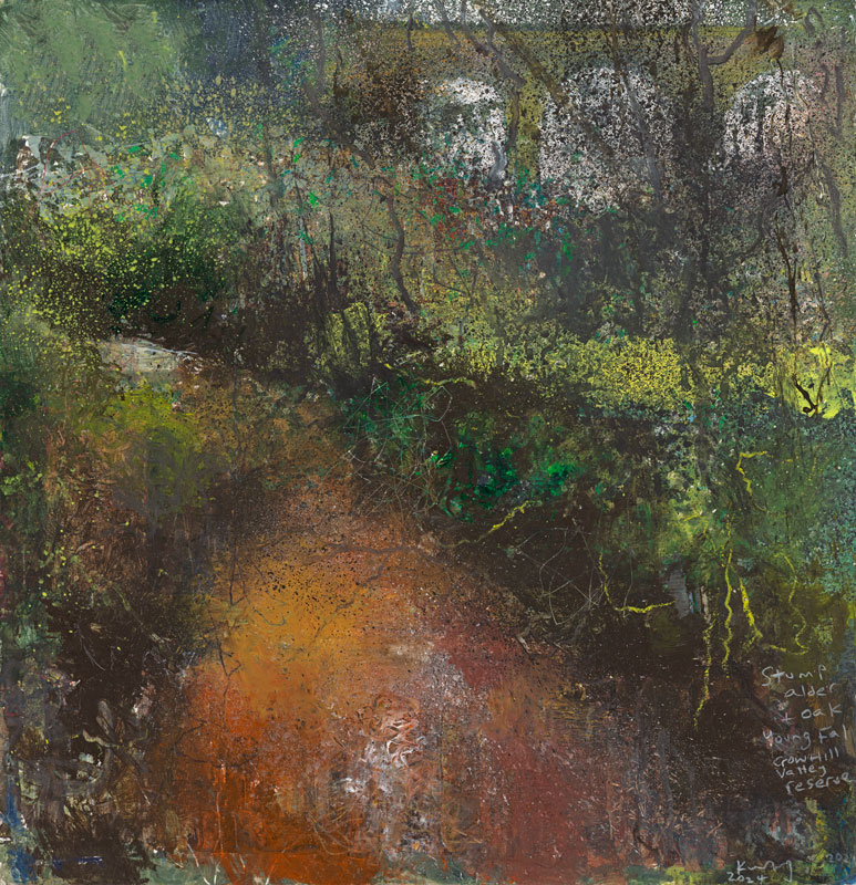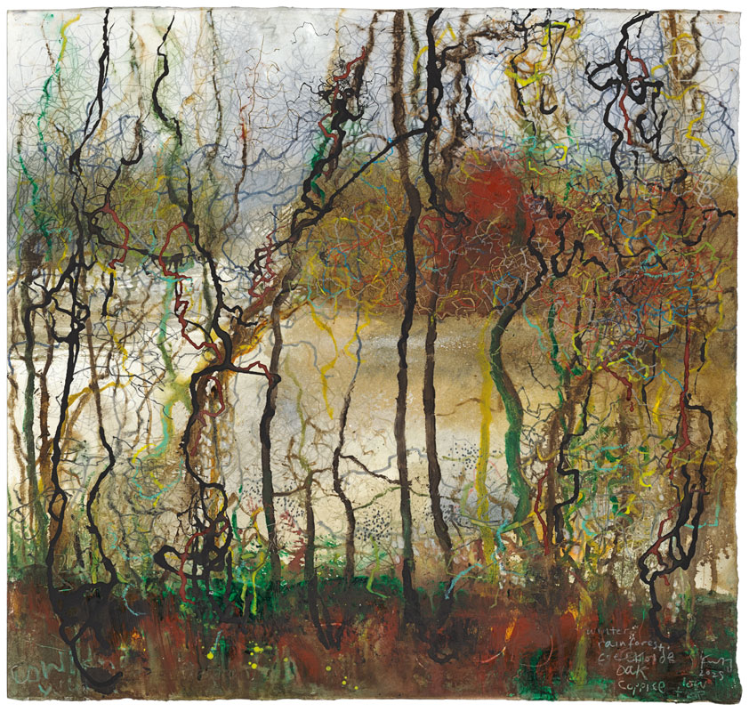 Winter rainforest, creekside oak coppice. Cowlands Wood. 2025. <br> <strong> mixed media on paper. <br> 57 x 59cm. <br> JF2099 <br> <br> SOLD </strong>View Larger Image