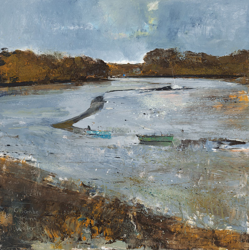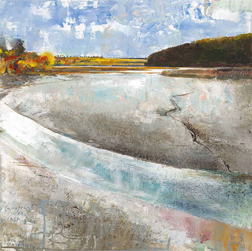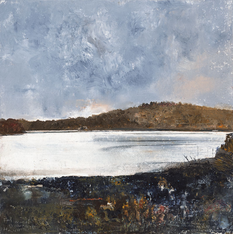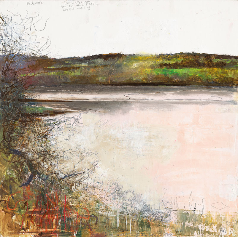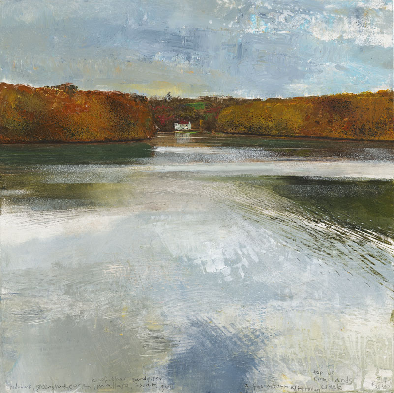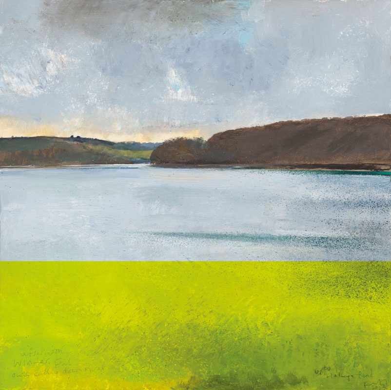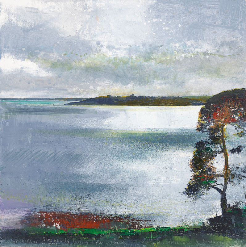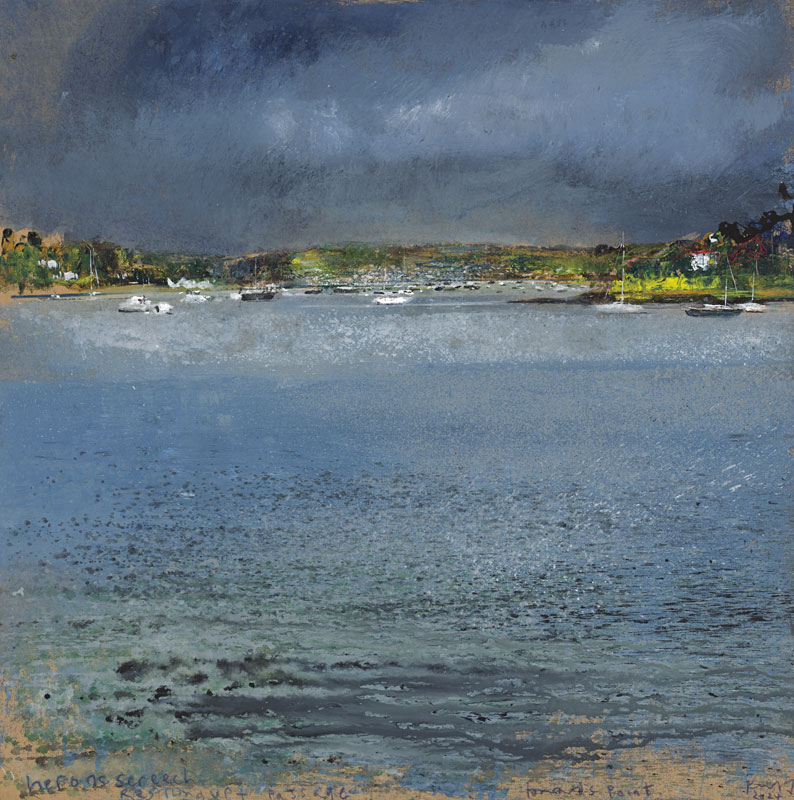 Herons screech. Restronguet Passage towards Point. 2024. <br> <strong>mixed media on board. <br> 60 x 60cm. <br> JF2137 <br> <br> SOLD </strong>View Larger Image