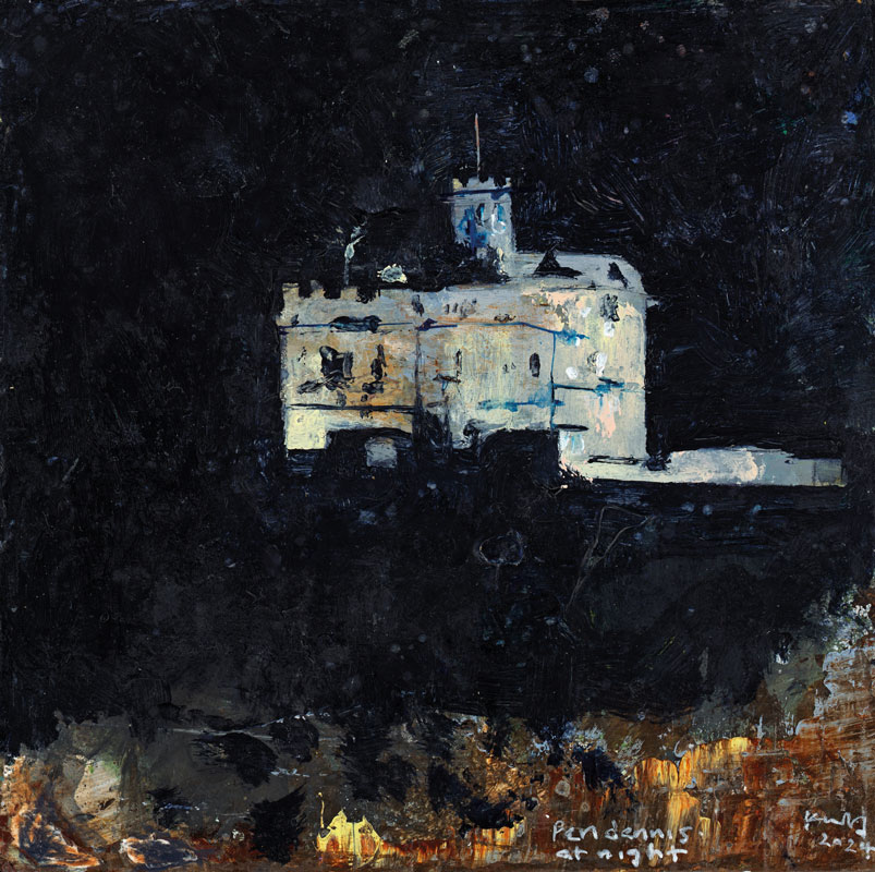 Pendennis at night. 2024. <br> <strong> mixed media on museum board. <br> 22 x 22cm. <br> JF2171 <br> <br> SOLD </strong>View Larger Image