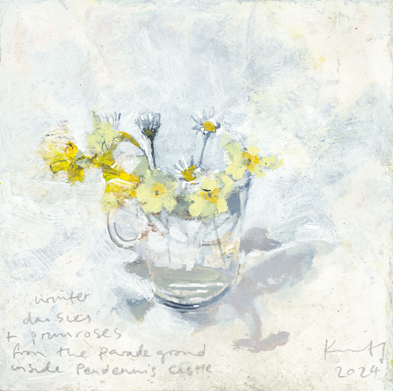 Pendennis daffodils. They grow on the ramparts. 2024. <br> <strong> mixed media on museum board. <br> 22 x 22cm. <br> JF2173 <br> <br> SOLD</strong>View Larger Image