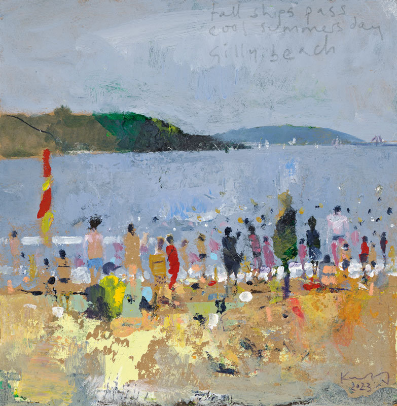 Tall ships pass, cool summers day. Gylly Beach. 2023. <br> <strong> mixed media on board. <br> 22 x 22cm. <br> JF2182 <br> <br> SOLD</strong>View Larger Image