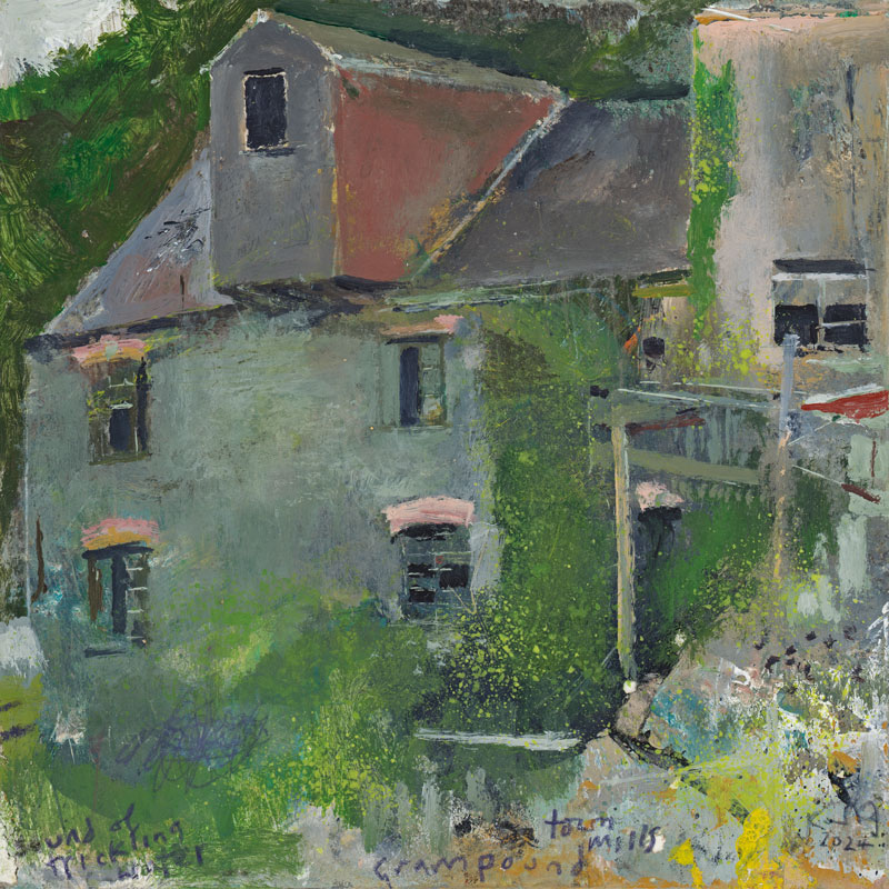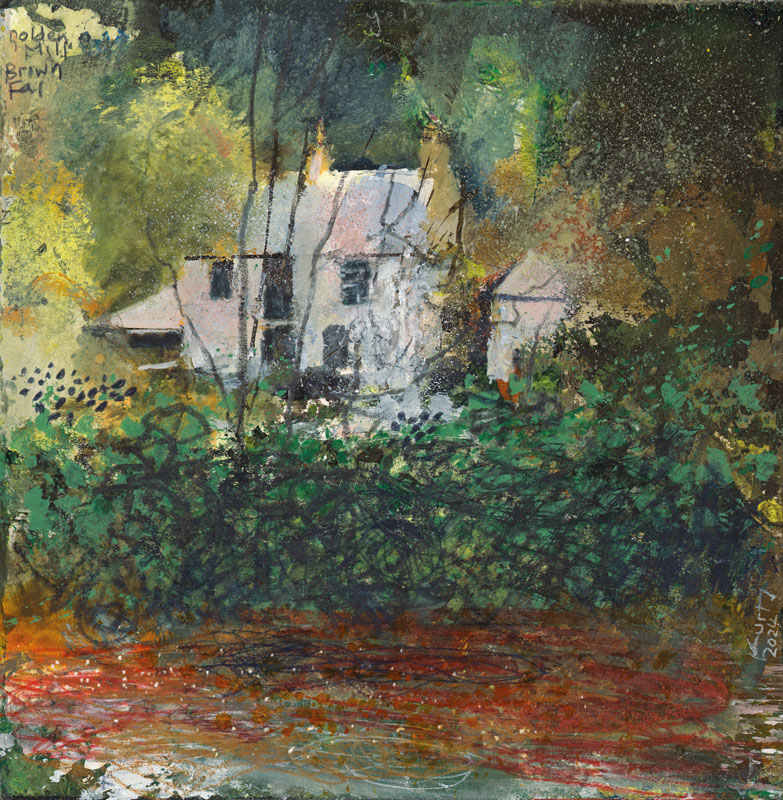 Golden Mill, brown Fal. 2024. <br> <strong> mixed media on museum board. <br> 22 x 22cm. <br> JF2080 <br> <br> £3,500 </strong>View Larger Image