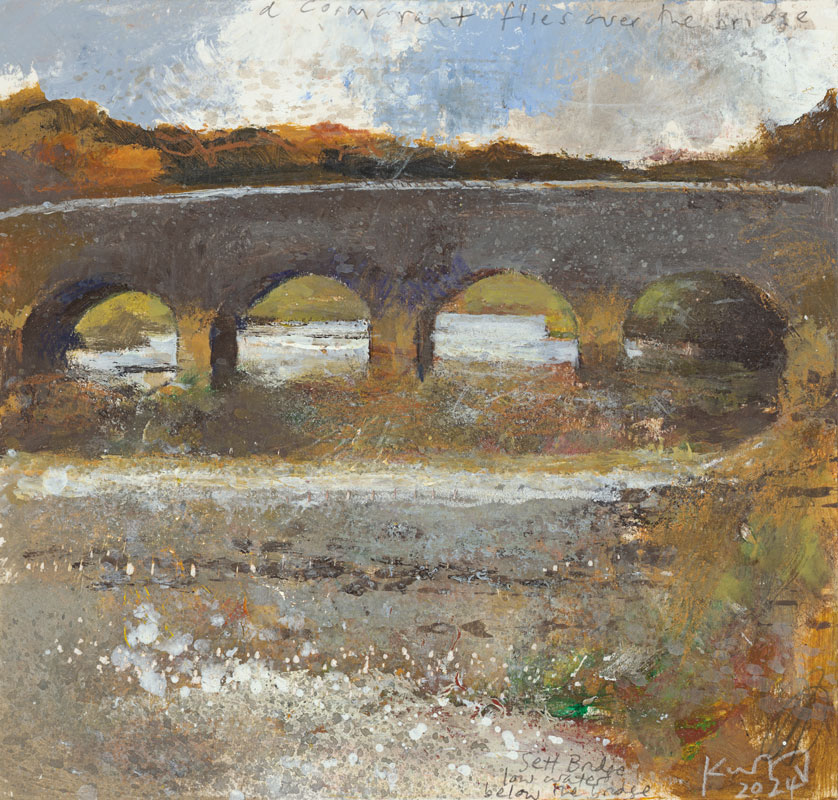 Sett Bridge, low water below the bridge. 2024. <br> <strong> mixed media on museum board. <br> 22 x 22cm. <br> JF2084 <br> <br> SOLD </strong>View Larger Image