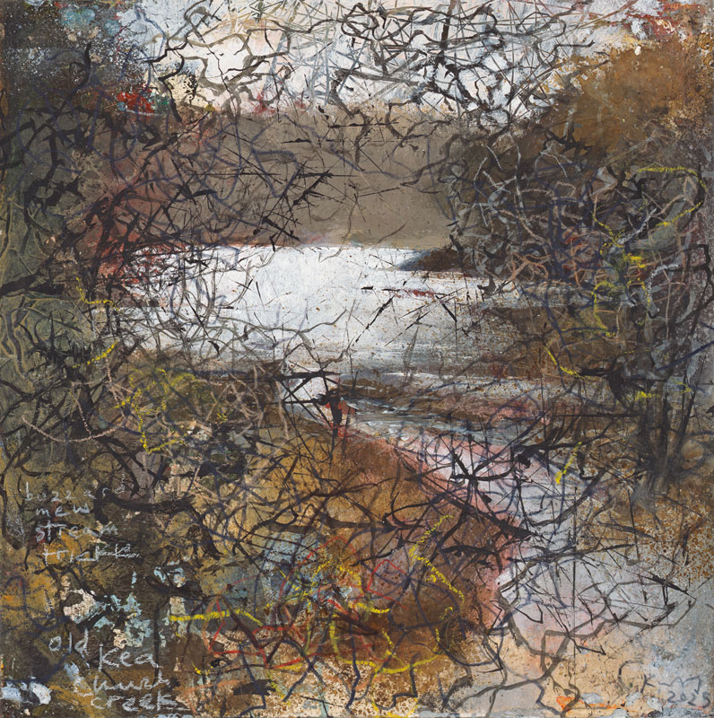 Church Creek, Old Kea, buzzard mew, stream trickle. 2025. <br> <strong>mixed media on museum board. <br> 22 x 22cm. <br> JF2091 <br> <br> SOLD </strong>View Larger Image
