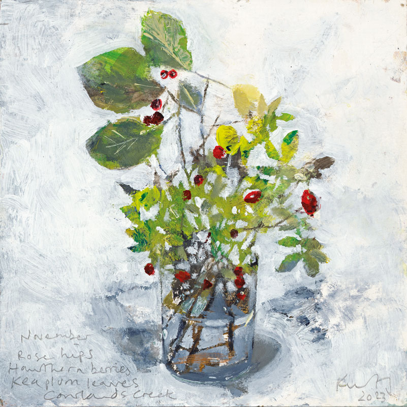 November rosehips, hawthorn berries and Kea plum leaves. Cowlands Creek. 2023.