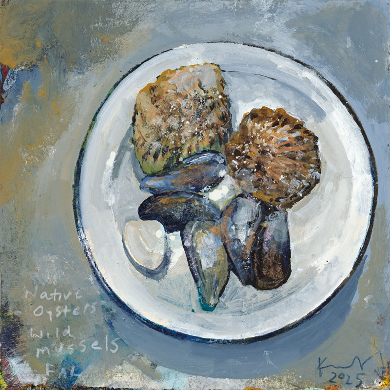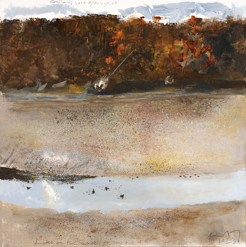 Mud and sunshine, bailing out the oyster punt at low water. 2023. <br> <strong> mixed media on museum board. <br> 60 x 60cm. <br> JF2113 <br> <br> SOLD </strong>View Larger Image