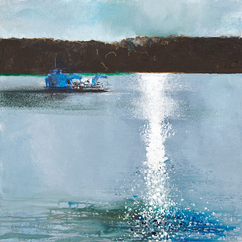 The St Mawes to Falmouth ferry. 2024. <br> <strong> mixed media on canvas board. <br> 40 x 40cm. <br> JF2167 <br> <br> £6,500</strong>View Larger Image