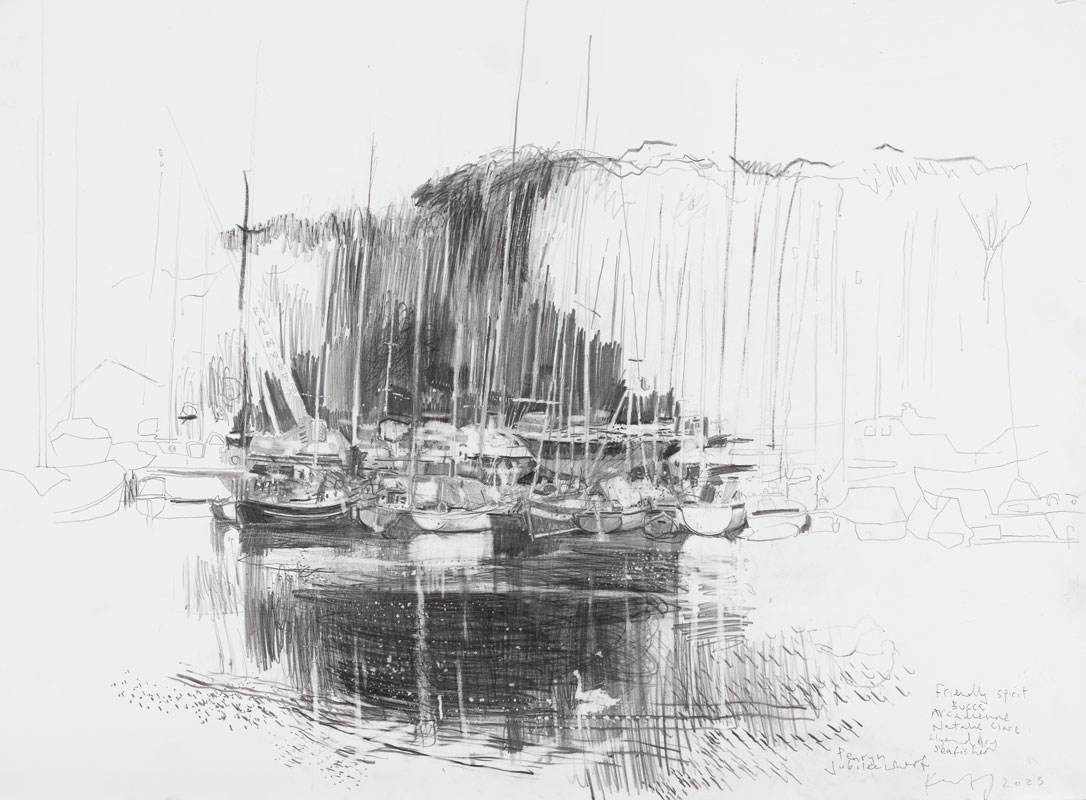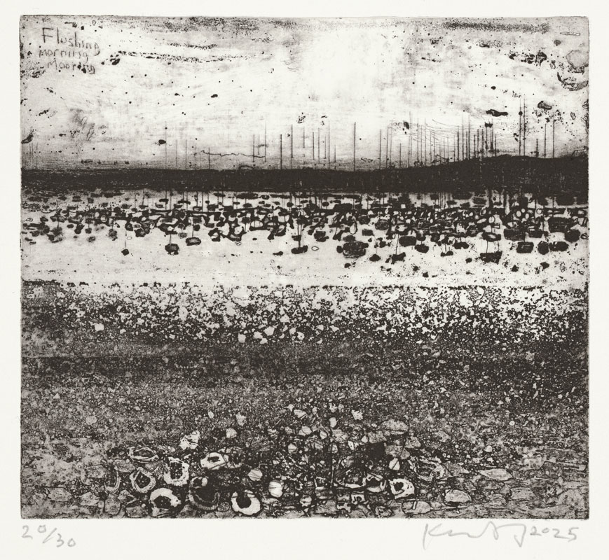 Flushing morning moorings. 2025. <br> <strong> etching and drypoint. <br> JF2154 <br> <br> edition of 30. <br> £400 (unframed) </strong>View Larger Image