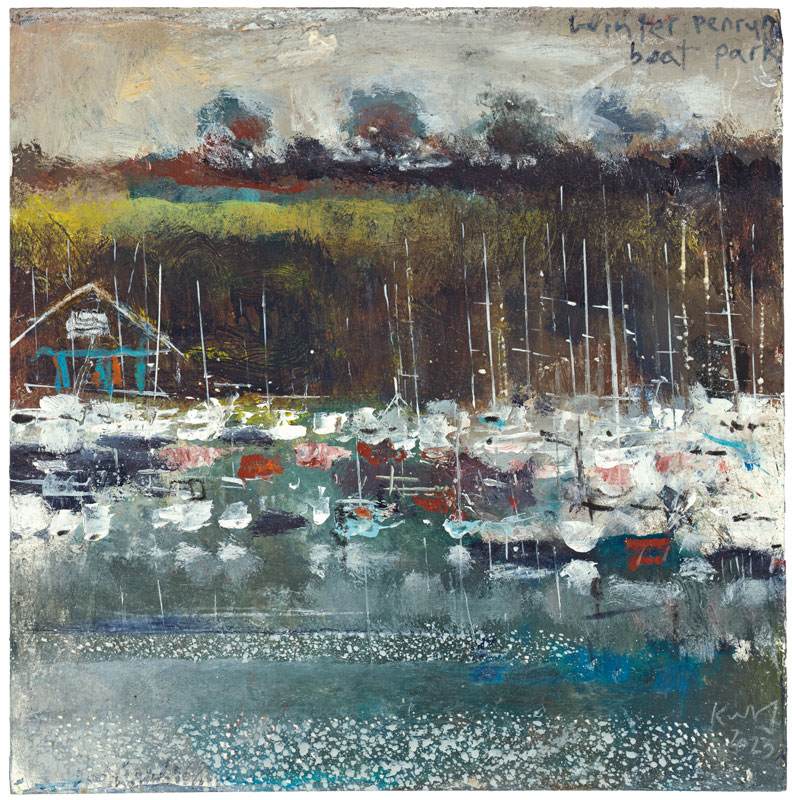 Winter Penryn boat park. 2025. <br> <strong>mixed media on museum board. <br> 22 x 22cm. <br> JF2145 <br> <br> SOLD</strong>View Larger Image