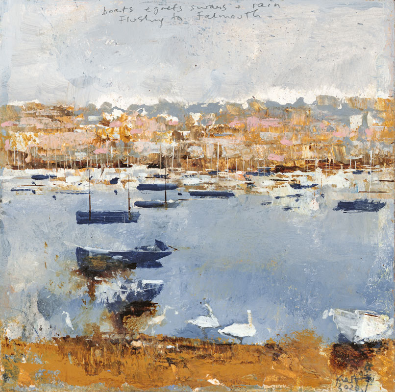 Boats, egrets, swans and rain Flushing to Falmouth. 2020. <br> <strong>mixed media on museum board. <br> 22 x 22cm. <br> JF2147 <br> <br> SOLD</strong>View Larger Image