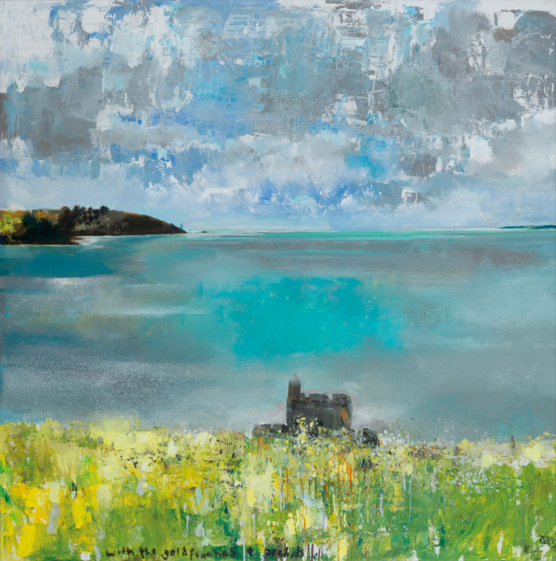 Blue Carrick Roads with gorse and blackthorn blossom. 2024. <br> <strong>mixed media on canvas board. <br> 60 x 60cm. <br> JF2143 <br> <br> SOLD </strong>View Larger Image