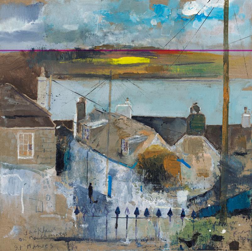 Jackdaws on the chimneys, St Mawes. 2024. <br> <strong> mixed media on canvas board. <br> 40 x 40cm. <br> JF2162 <br> <br> £6,500</strong>View Larger Image