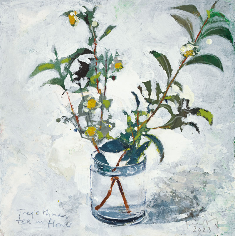 Tregothnan tea in flower. 2023. <br> <strong> mixed media on museum board. <br> 22 x 22cm. <br> JF2123 <br> <br> SOLD </strong>View Larger Image