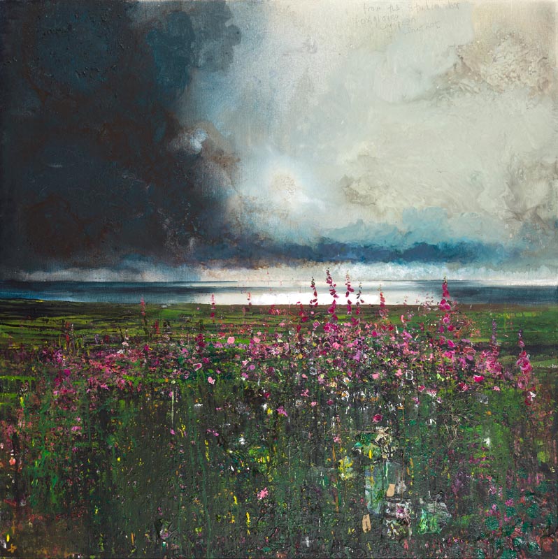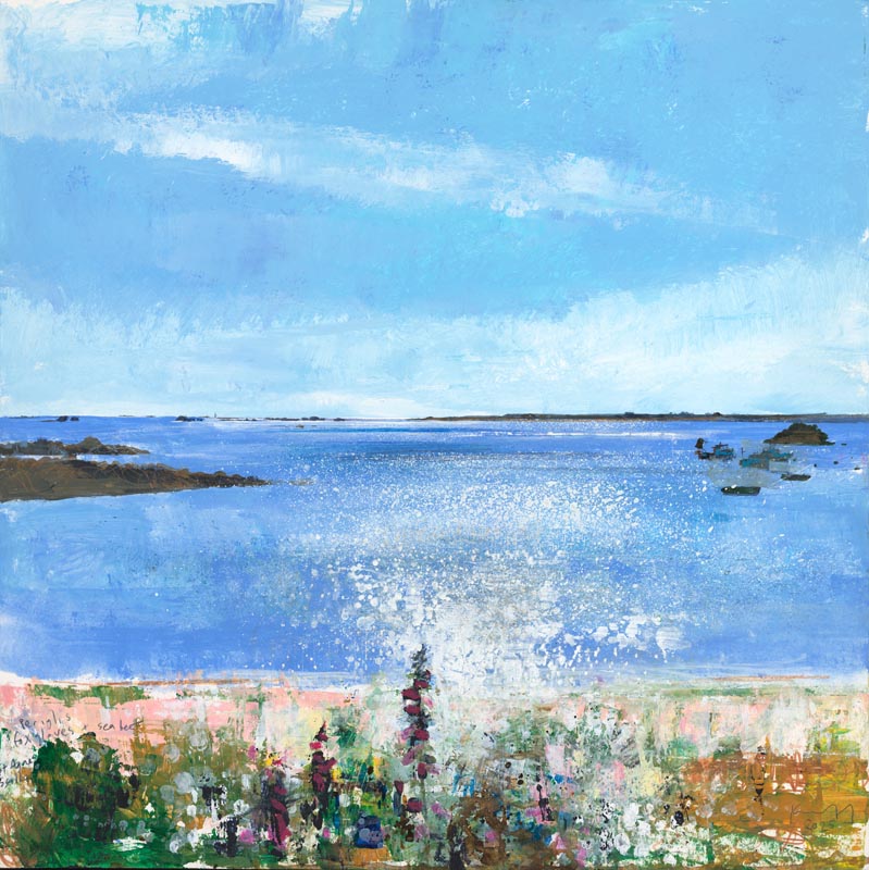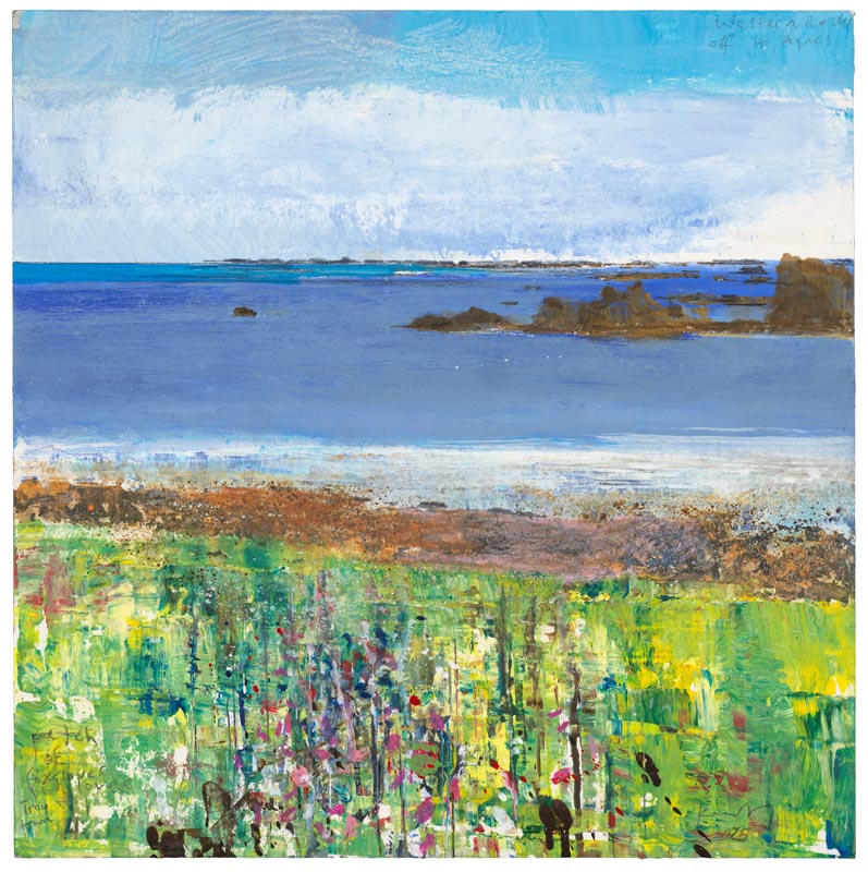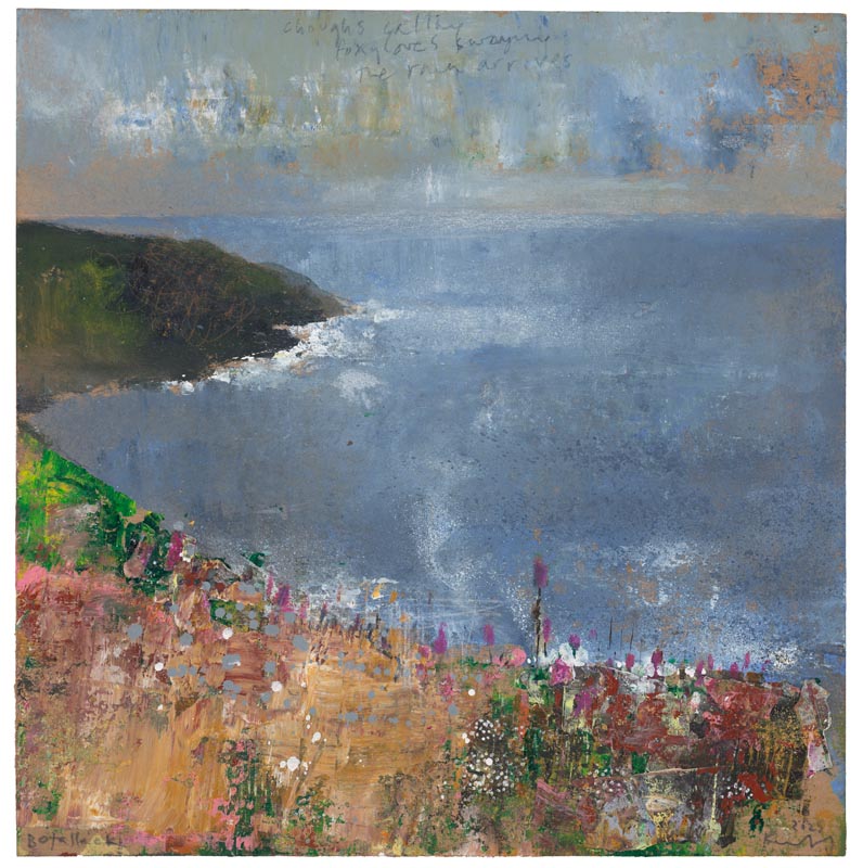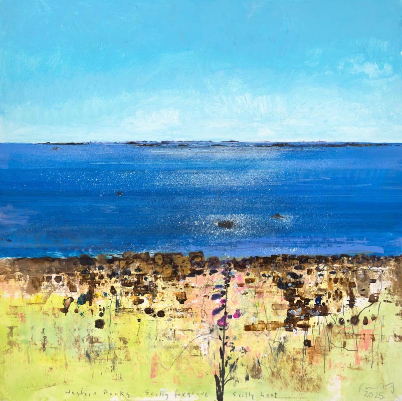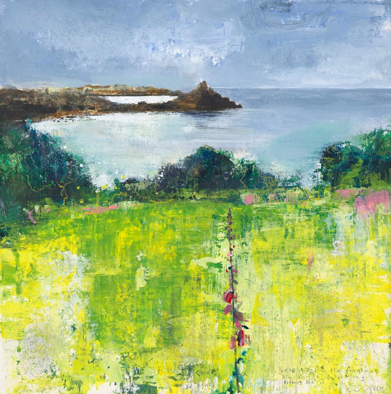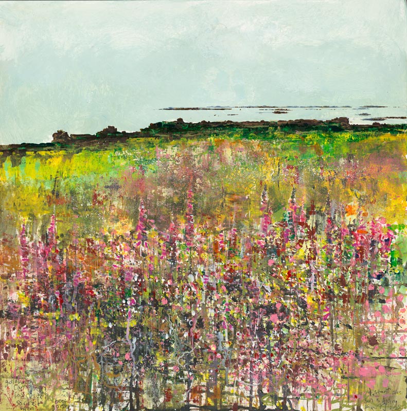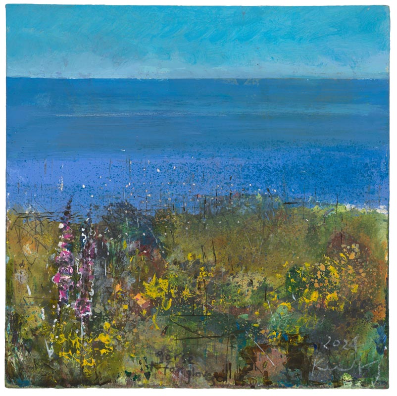 Western Rocks off St Agnes. Troy Town patch of foxgloves. 2025. <br> <strong> mixed media on museum board. <br> 40 x 40cm. <br> JF2256 <br> <br> £6,500 </strong>View Larger Image