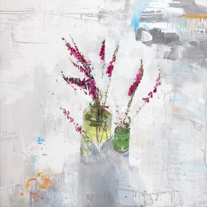Pint of Scillonian foxgloves, gladioli and campion. 2025. <br> <strong> mixed media on museum board. <br> 22 x 22cm. <br> JF2231 <br> <br> £3,500 </strong>View Larger Image