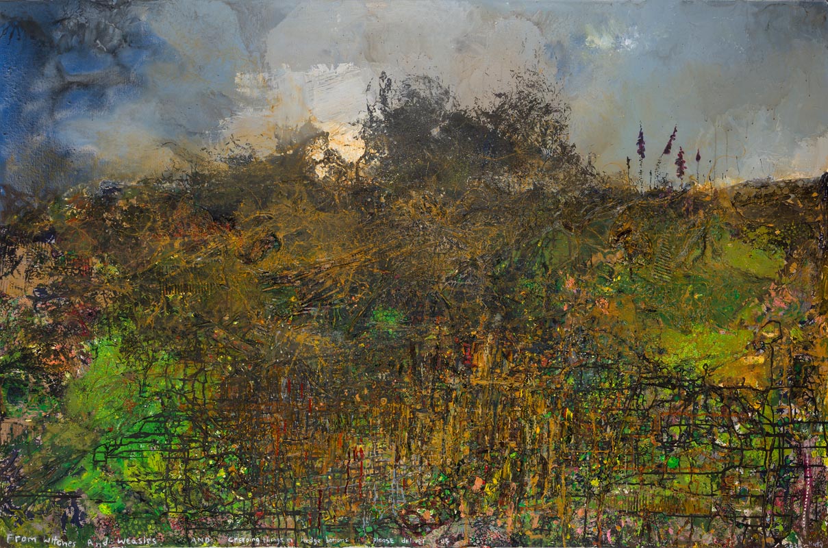 From witches and weasels…. 2025. <br> <strong> oil and mixed media on canvas. <br> 122 x 183cm. <br> JF2218 <br> <br> POA </strong>View Larger Image