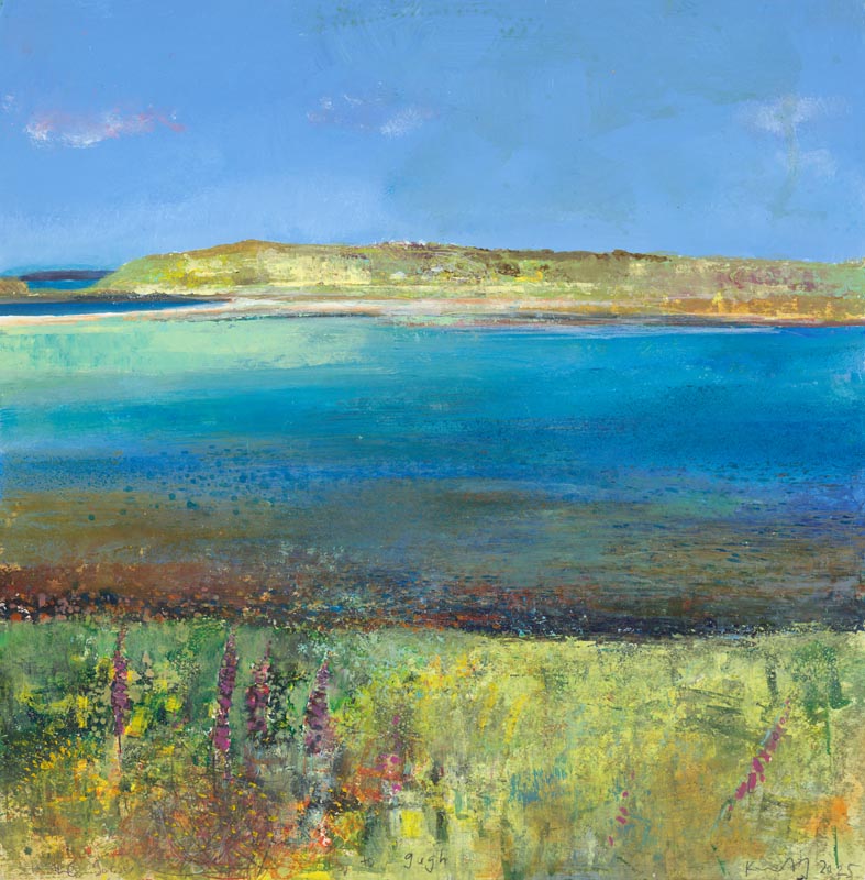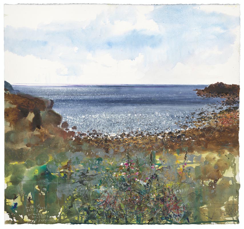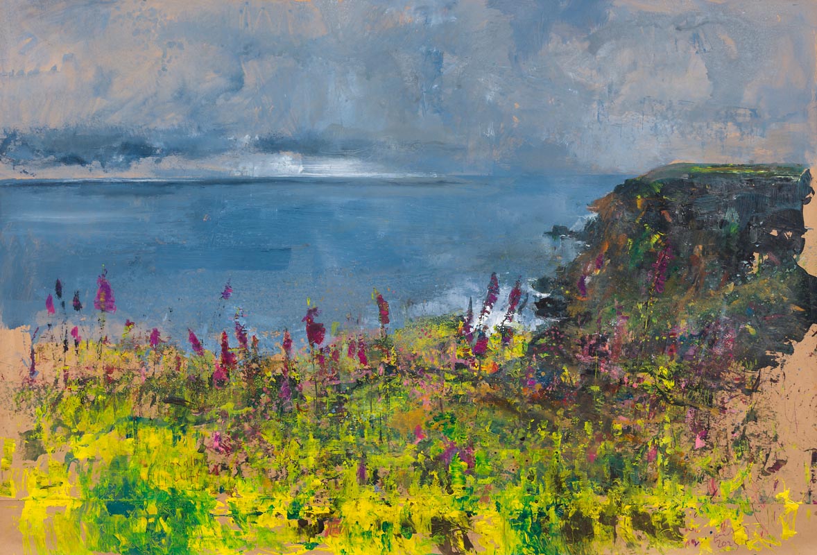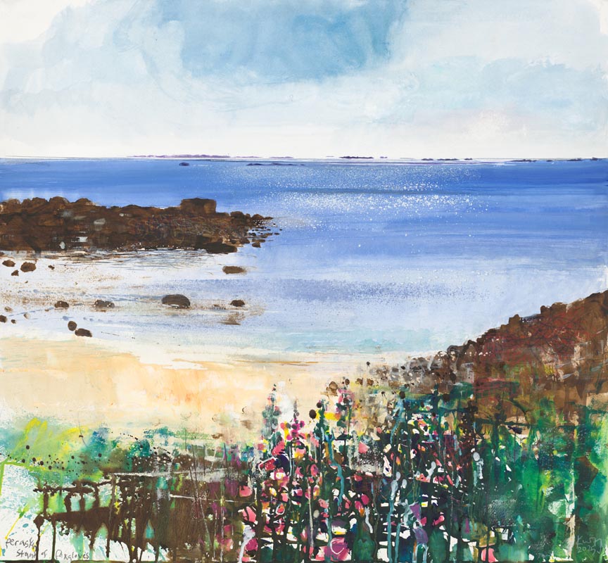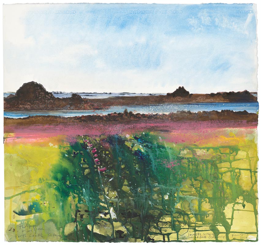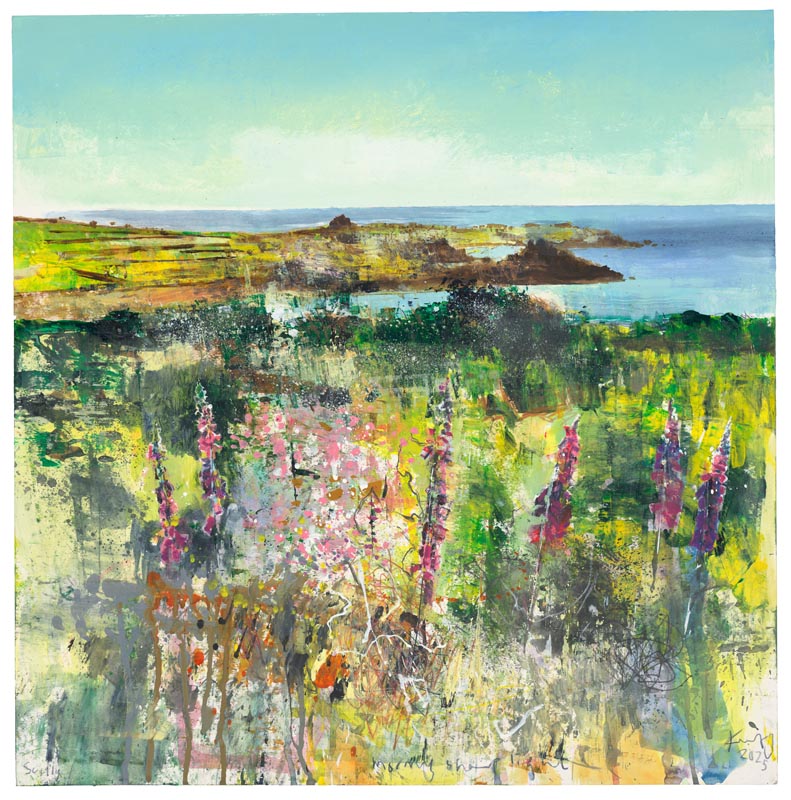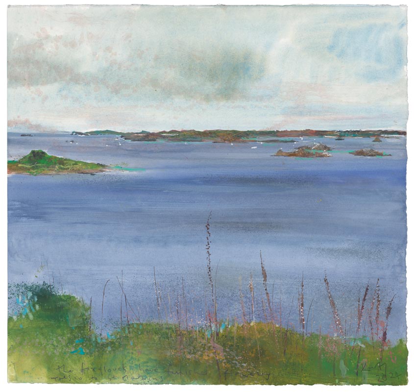 The foxgloves have finished flowering. Tresco to St Martins. 2024. <br> <strong> mixed media on paper. <br> 57 x 60cm. <br> JF2278 <br> <br> £8,500 </strong>View Larger Image