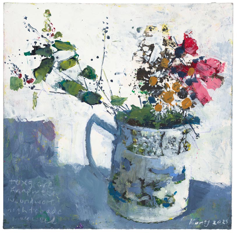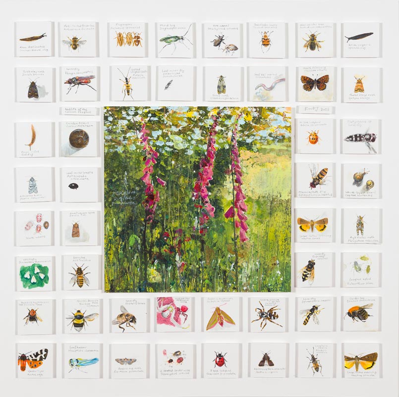 Foxglove, knapweed, woundwort, nightshade, mayweed. 2025. <br> <strong> mixed media on museum board. <br> 22 x 22cm. <br> JF2238<br> <br> SOLD </strong>View Larger Image