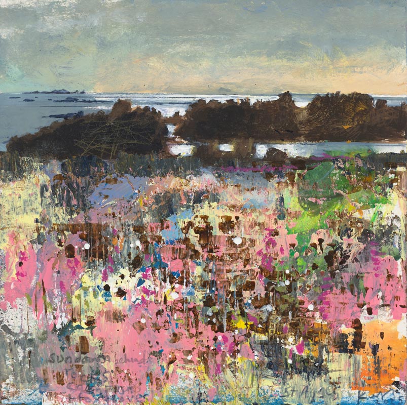 Sun down behind the rocks, campion and foxgloves. St Agnes 2025. <br> <strong> mixed media on museum board. <br> 22 x 22cm. <br> JF2228 <br> <br> SOLD </strong>View Larger Image