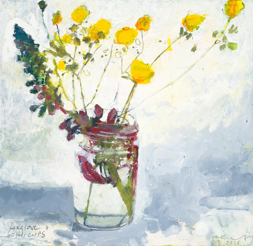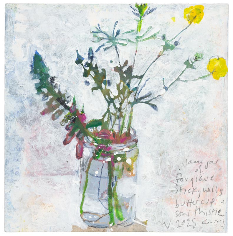 Jam jar of foxglove, sticky willy, buttercup and sow thistle. 2025.