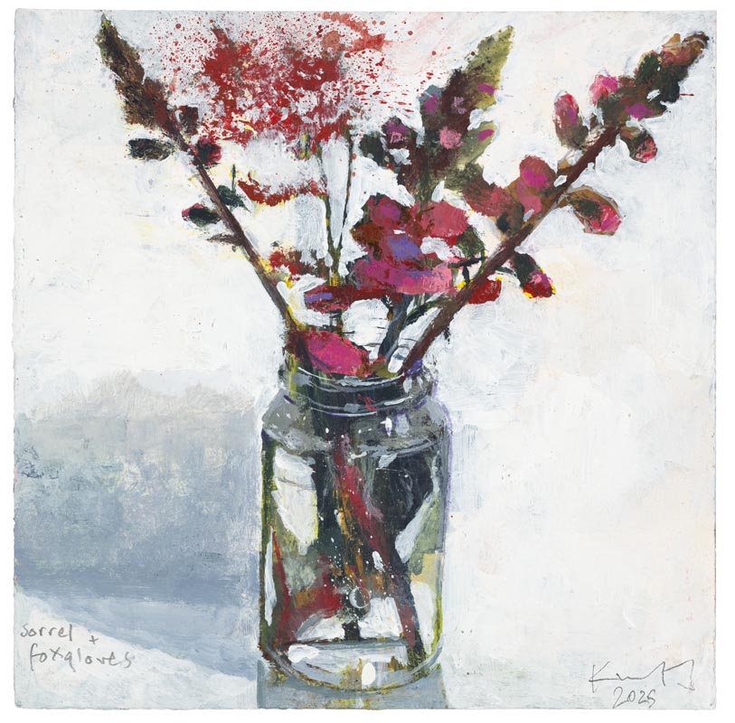 Sorrel and foxgloves. 2025. <br> <strong> mixed media on museum board. <br> 22 x 22cm. <br> JF2236 <br> <br> SOLD </strong>View Larger Image