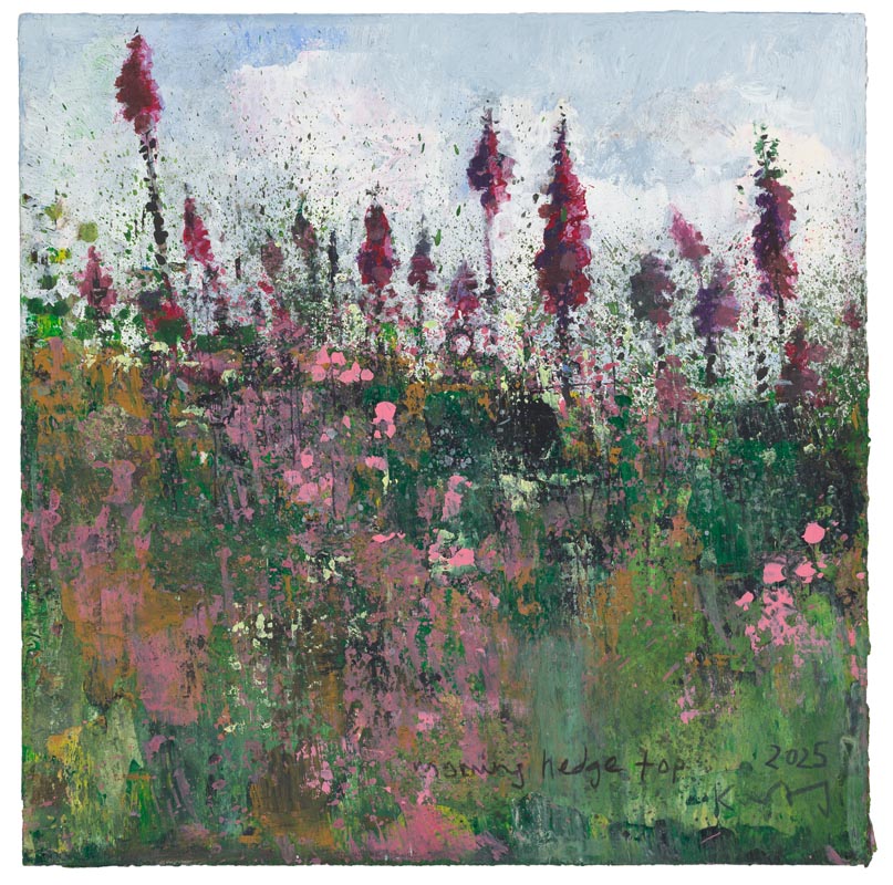 Morning hedgetop. 2025. <br> <strong> mixed media on museum board. <br> 22 x 22cm. <br> JF2243 <br> <br> SOLD </strong>View Larger Image
