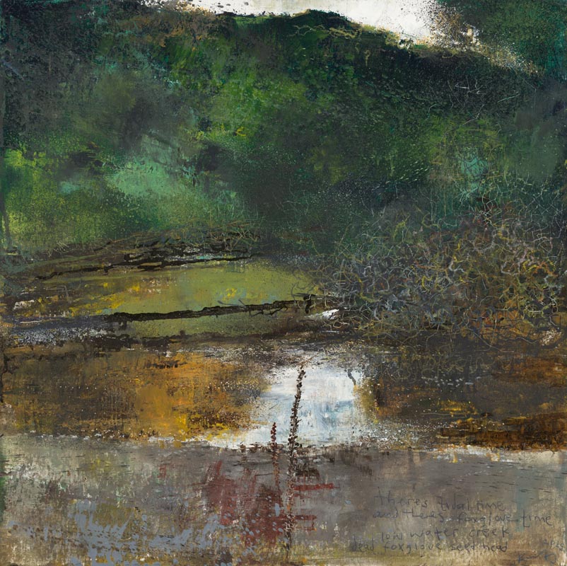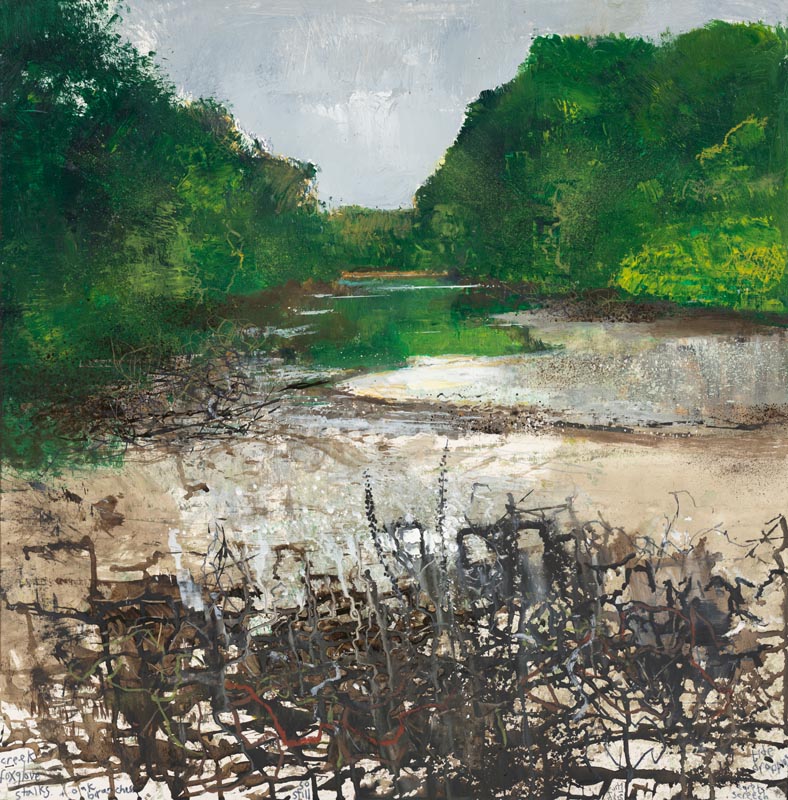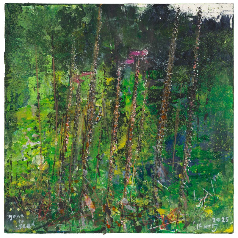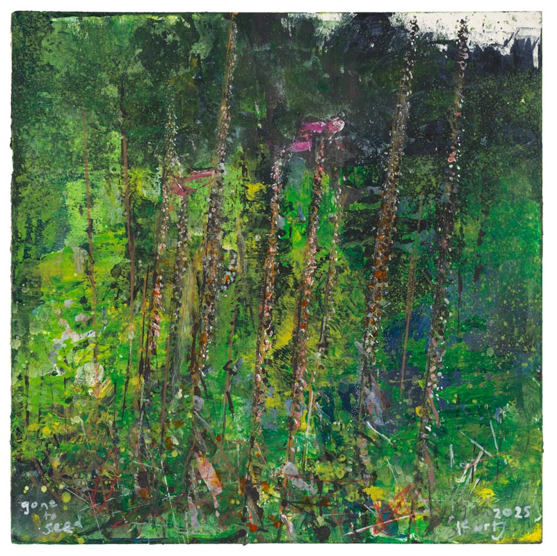 Creek. Foxglove stalks and oak branches. 2025. <br> <strong> mixed media on museum board. <br> 60 x 60cm. <br> JF2279 <br> <br> £8,500 </strong>View Larger Image