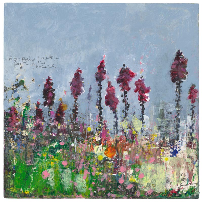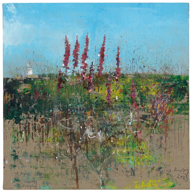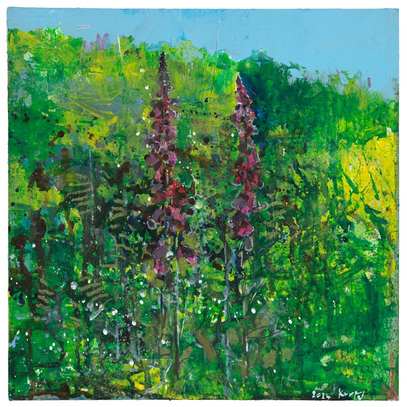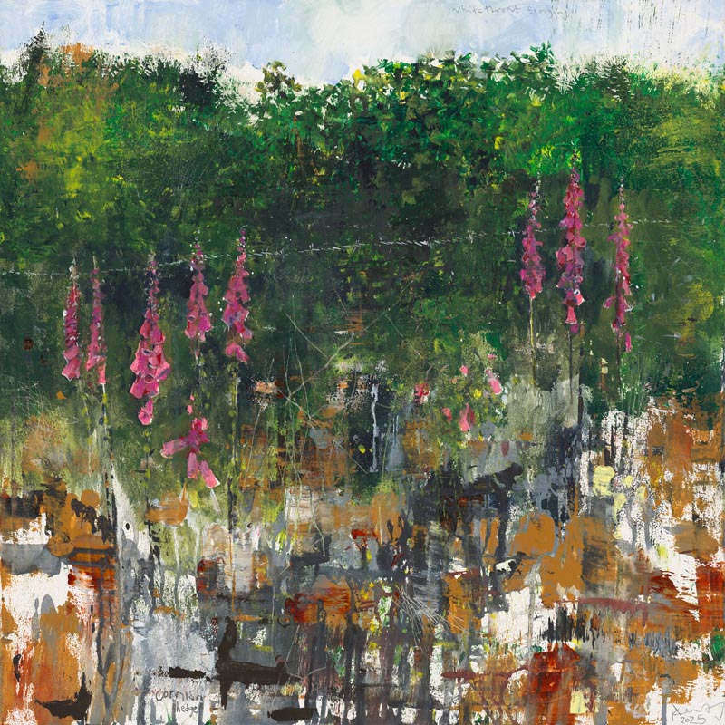 Hot foxgloves, St Agnes. 2025. <br> <strong> mixed media on museum board. <br> 22 x 22cm. <br> JF2239 <br> <br> £3,500 </strong>View Larger Image