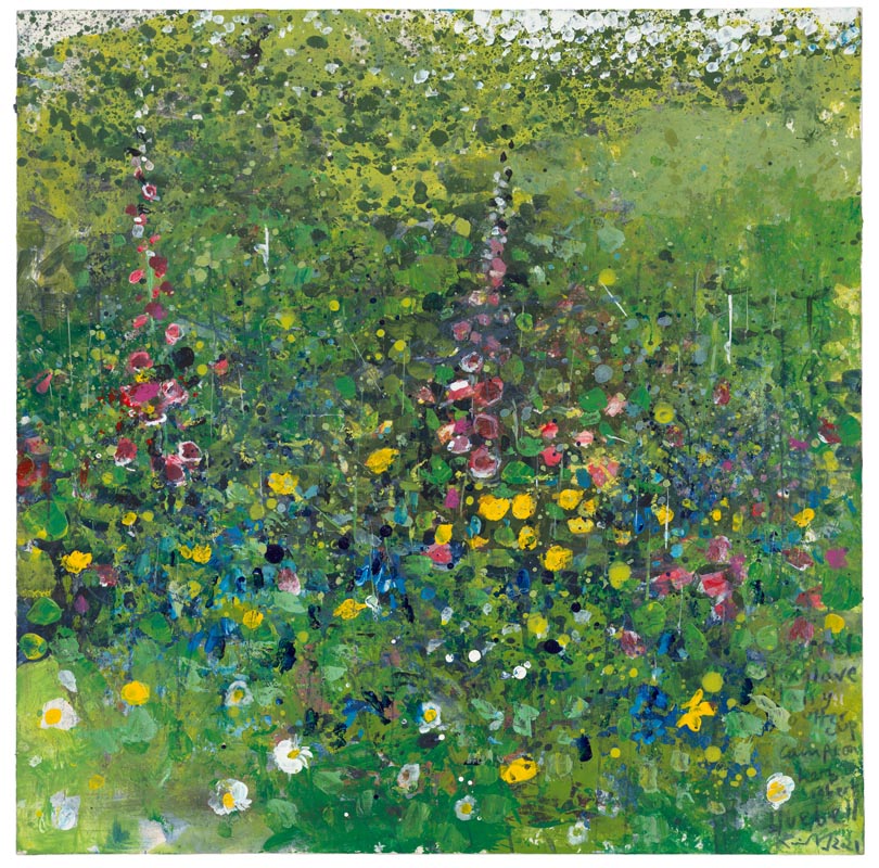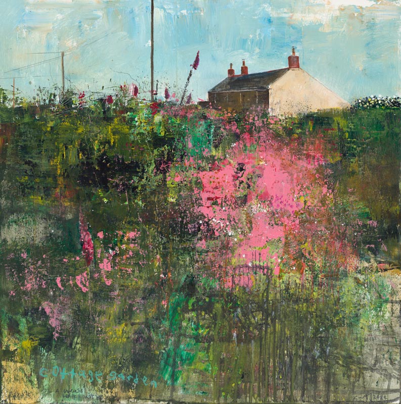 Cottage garden. 2024. <br> <strong> mixed media on wood panel. <br> 60 x 60cm. <br> JF2273 <br> <br> £8,500 </strong>View Larger Image