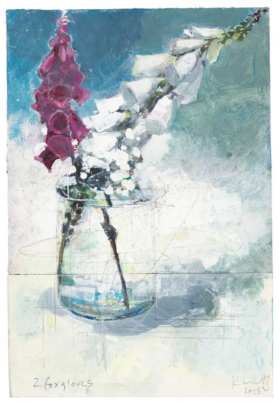 Two foxgloves. 2025. <br> <strong> mixed media on museum board. <br> 31.5 x 21.5cm. <br> JF2252 <br> <br> SOLD </strong>View Larger Image