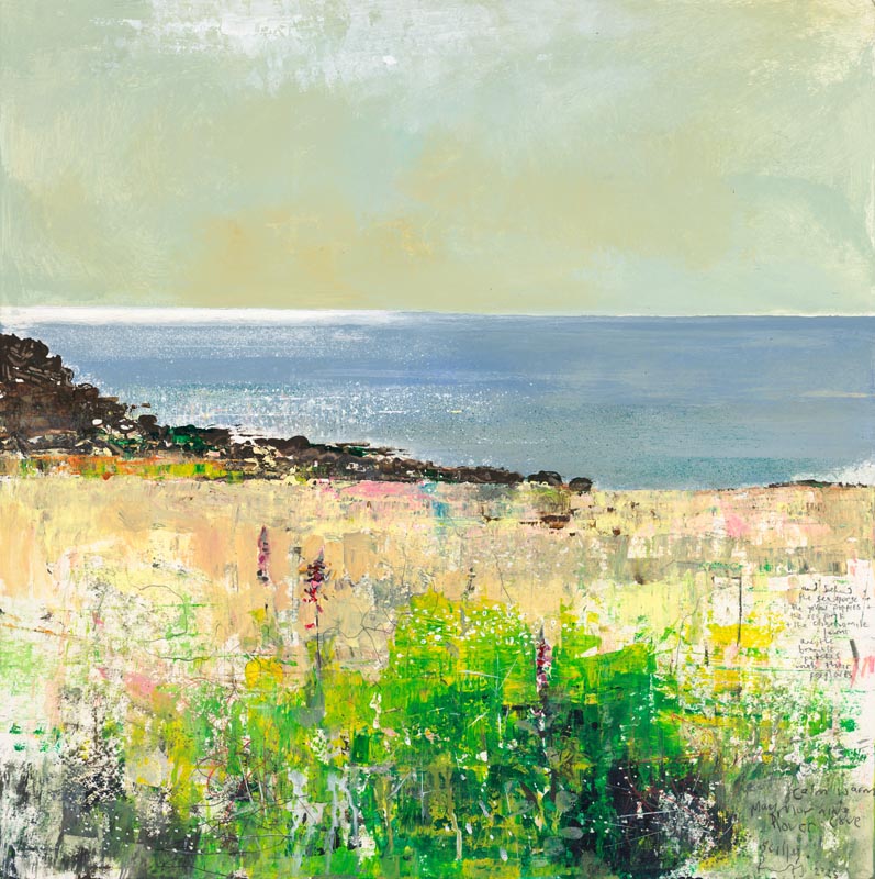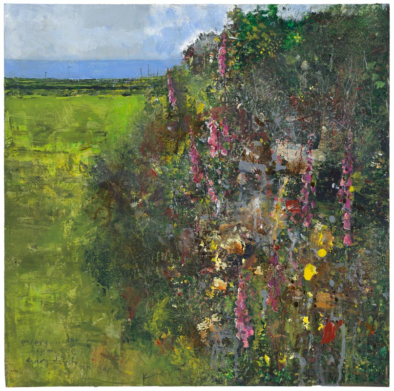 Cornish hedge, whitethroat singing. 2025. <br> <strong> mixed media on wood panel. <br> 60 x 60cm. <br> JF2284 <br> <br> £8,500 </strong>View Larger Image
