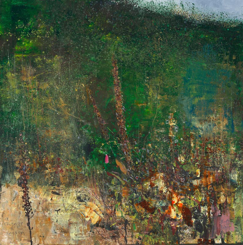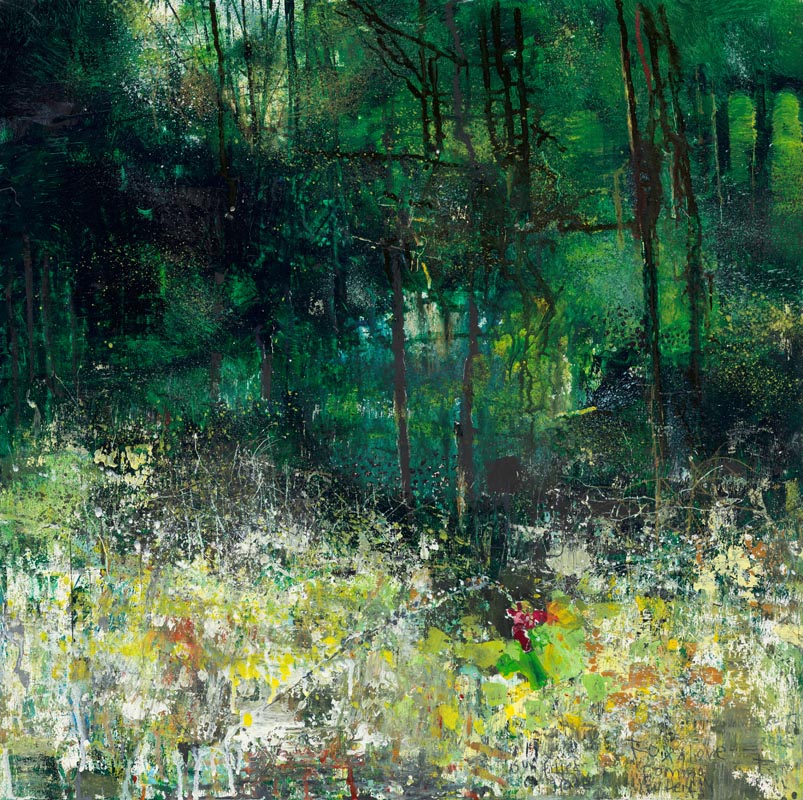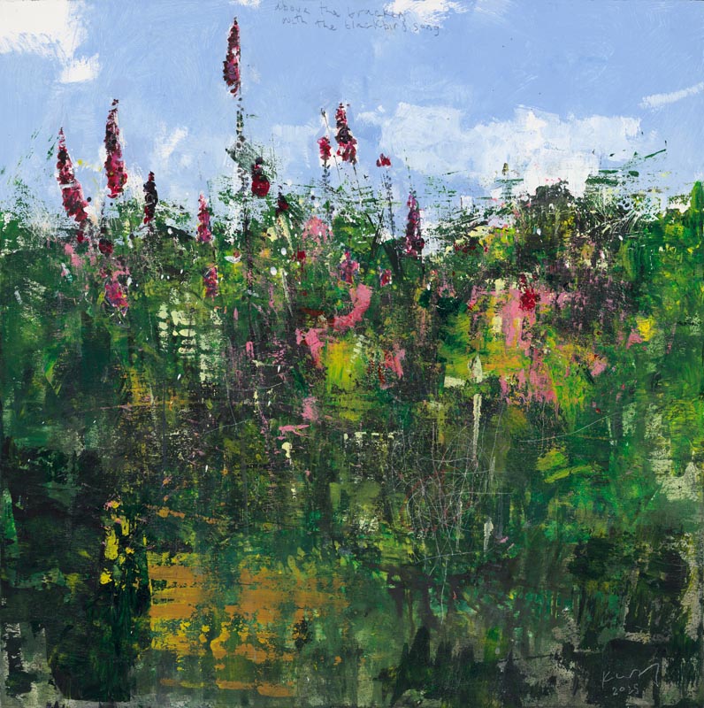 Above the bracken with the blackbird song. 2025. <br> <strong> mixed media on wood panel. <br> 60 x 60cm. <br> JF2263 <br> <br> £8,500 </strong>View Larger Image