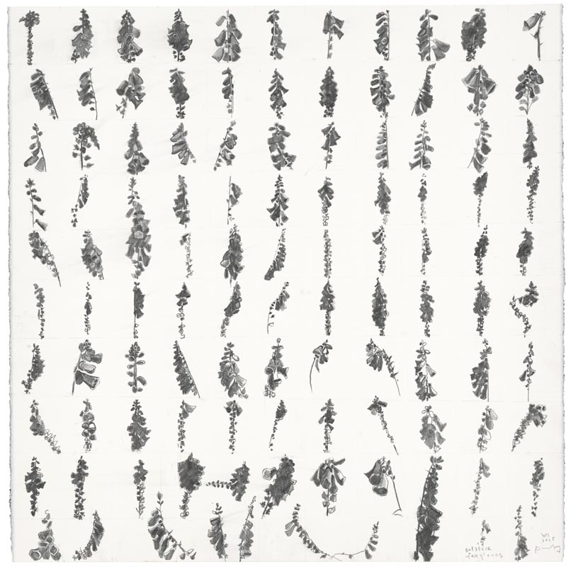 Solstice foxgloves. 2025. <br> <strong> pencil on paper. <br> 57 x 57cm. <br> JF2276 <br> <br> £5,500 </strong>View Larger Image
