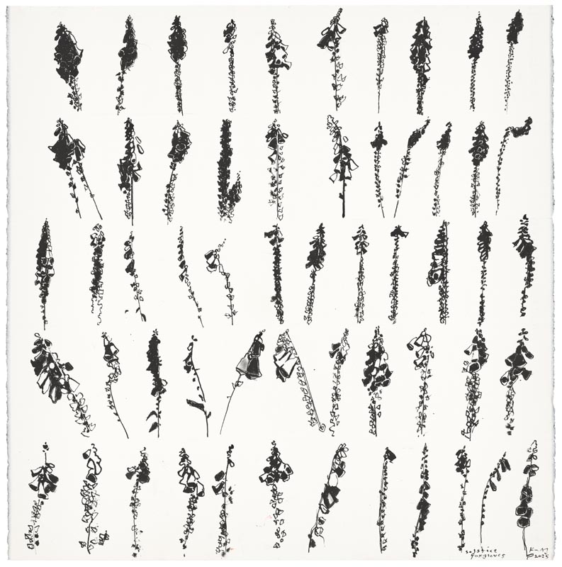 Solstice foxgloves. 2025. <br> <strong> ink on paper. <br> 57 x 57cm. <br> JF2277 <br> <br> £5,500 </strong>View Larger Image