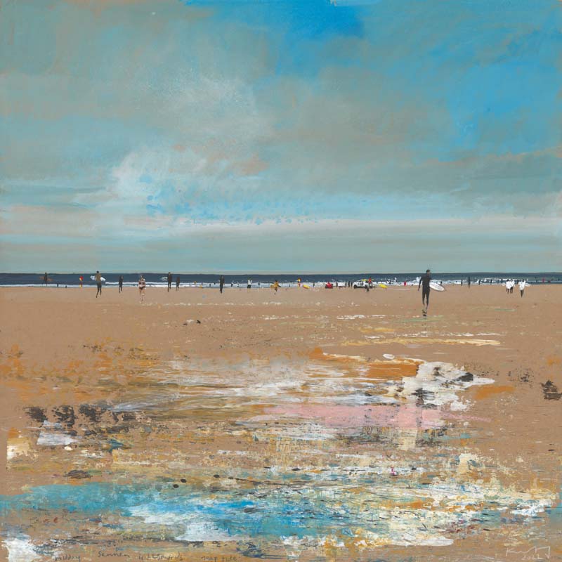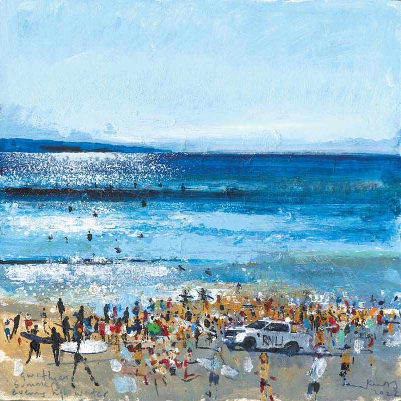 Lifeguards and surfers, Porthtowan. Summer’s morning. 2022. <br> <strong>mixed media on museum board. <br> 50 x 50cm. <br> JF1564 <br> <br> SOLD </strong>