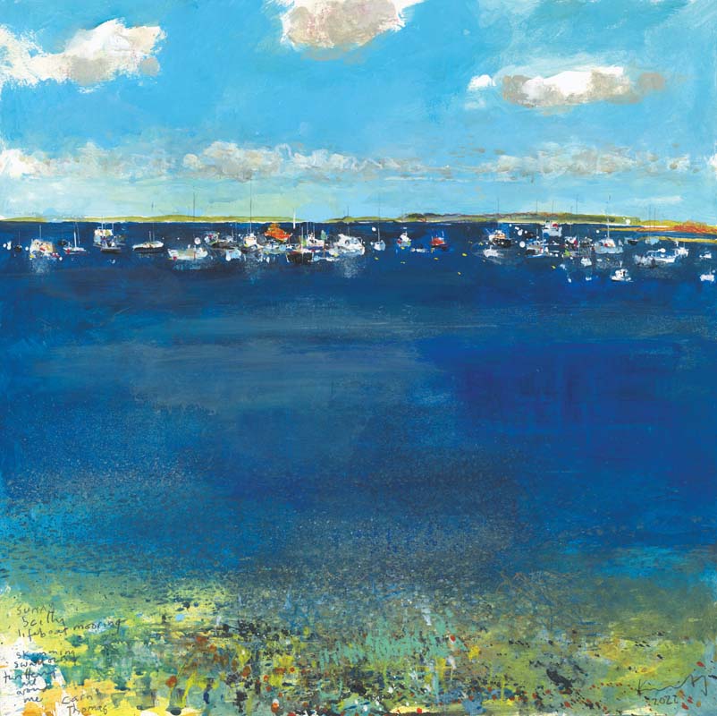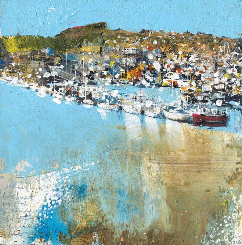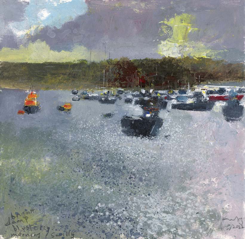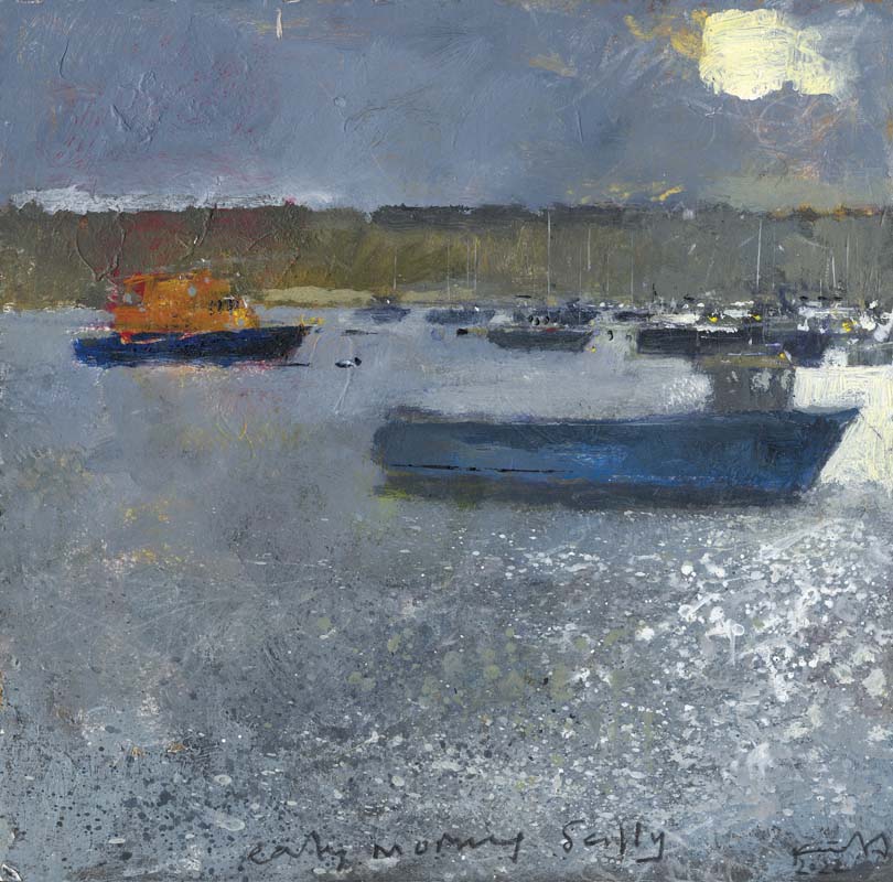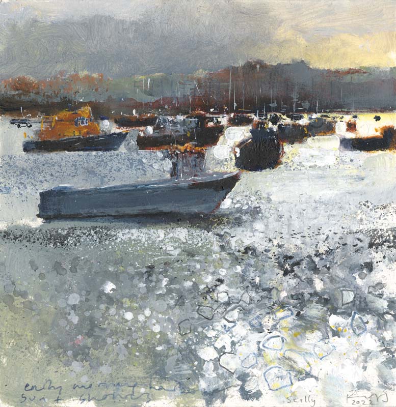 Scilly harbour morning. 2022. <br> <strong> mixed media on museum board. <br> 22 x 22cm. <br> JF1613 <br> <br> SOLD </strong>
