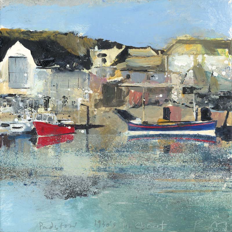 Padstow 1930’s lifeboat. 2022. <br> <strong> mixed media on museum board. <br> 22 x 22cm. <br> JF1580 <br> <br> SOLD </strong>