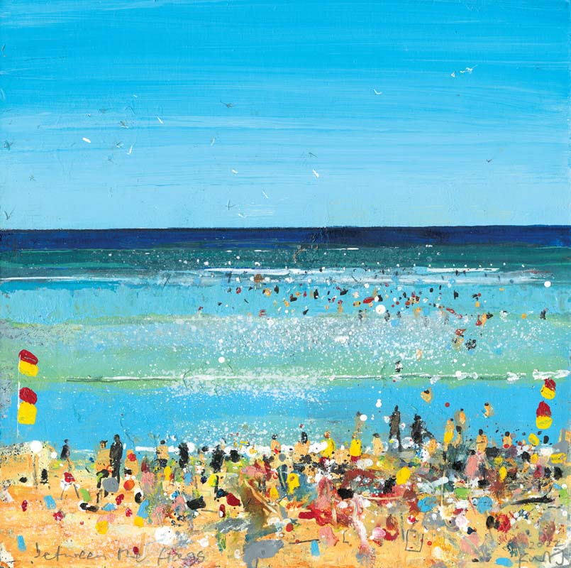 Above Gwenver lifeguards’ hut, hottest day of the year. 2022. <br> <strong> mixed media on museum board. <br> 60 x 60cm. <br> JF1557 <br> <br> SOLD </strong>