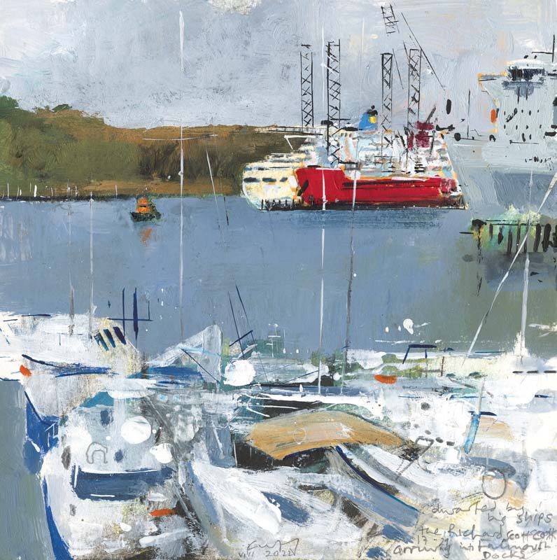 Dwarfed by big ships, the Richard Scott Cox arriving into Falmouth Docks. 2022.