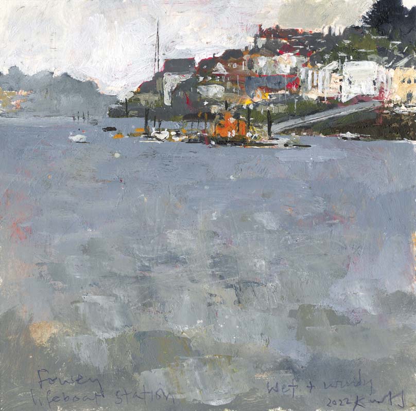Dark river, Fowey lifeboat. 2022. <br> <strong> mixed media on museum board. <br> 22 x 22cm. <br> JF1611 <br> <br> £3,500 </strong>